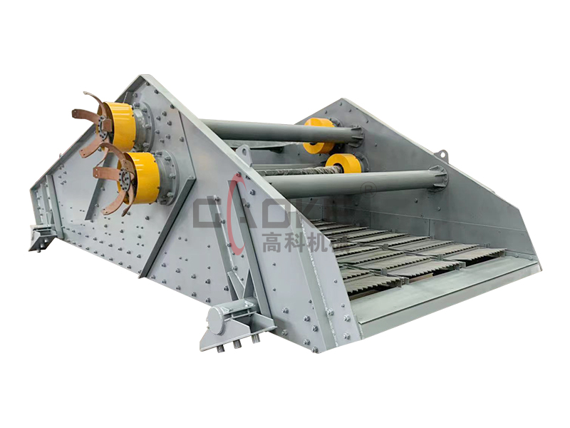 香蕉型振動篩篩箱近似于香蕉形狀,運動軌跡為橢圓,篩面擁有20°傾角,物料進入篩面后在振動力的作用下迅速前進、松散透篩,完成篩分作業。高科機械GKXJ系列香蕉型振動篩使用激振器作為振動源,激振力大小可調整,篩分精度高,處理能力強。